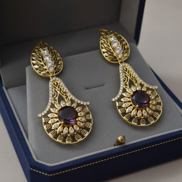 Add a touch of glamour to any occasion with these elegant gold-plated leaf design earrings, featuring a stunning arrangement of purple gemstones at their center. The intricate metalwork and sparkling stones come together to create a luxurious yet timeless accessory. Perfectly suited for formal events, weddings, or festive occasions, these earrings offer an effortless blend of contemporary style and traditional beauty. Encased in an elegant wooden box, they make a stunning gift for a loved one or a treasured addition to your own jewelry collection.