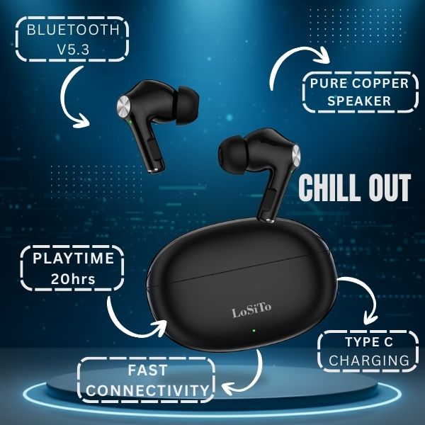 The LoSito Chillout True Wireless Earbuds are a perfect choice for users looking for powerful sound, long battery life, clear calling, and reliable wireless performance, all packed into a stylish and affordable true wireless audio solution.